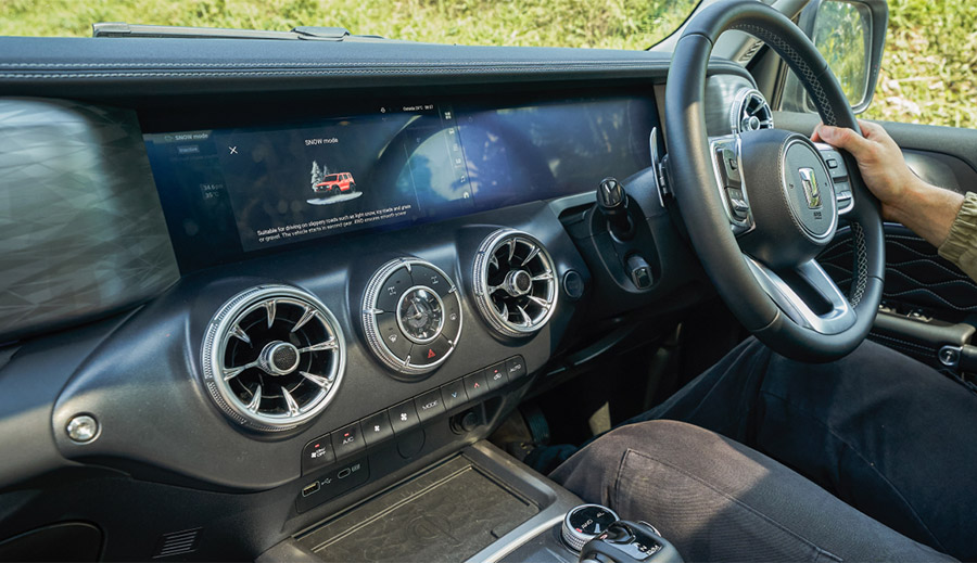 Tepat di bawah dashboard terdapat dua knob yang berfungsi untuk mengganti mode driving serta sistem penggerak. Knob bagian kiri bisa digunakan untuk mengganti driving mode di Tank 300. Mobil ini dilengkapi dengan 6 driving mode, yakni Sand, Snow, Sport, Normal, ECO, dan Mud.
